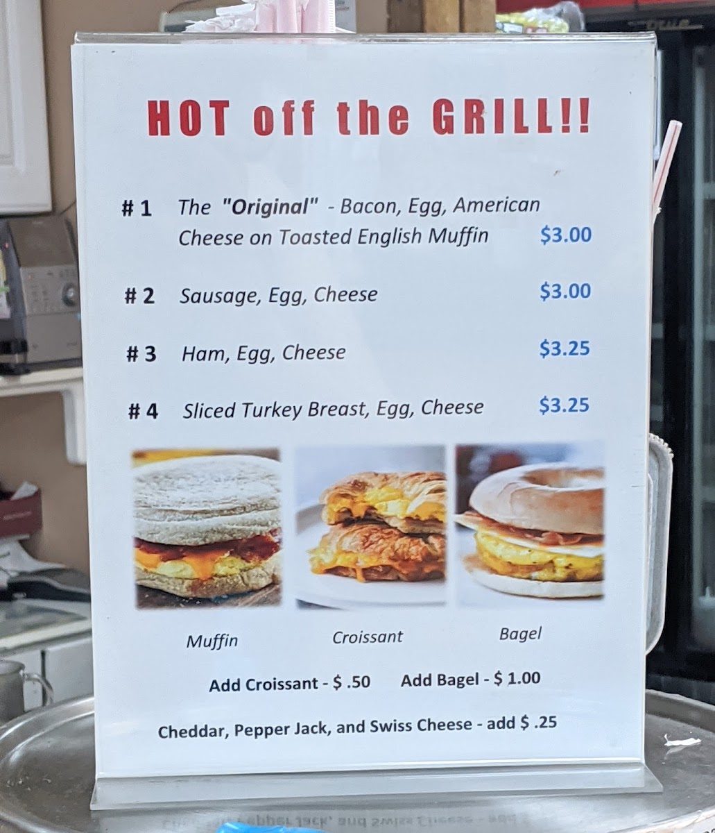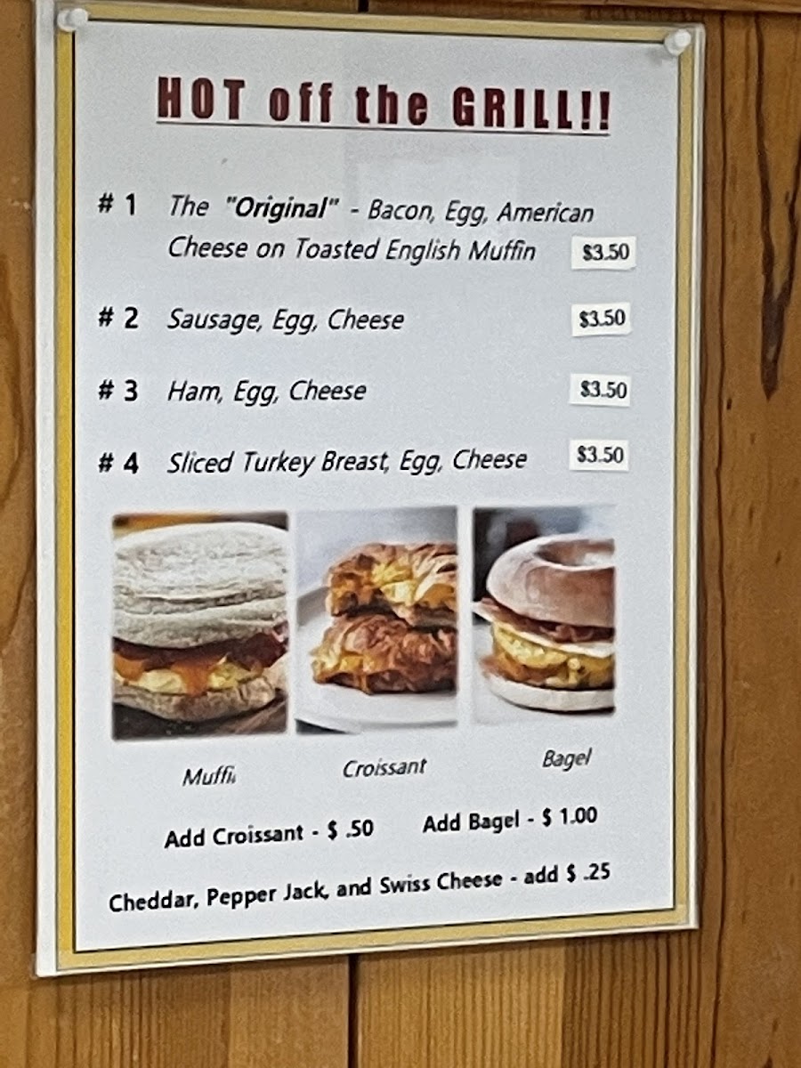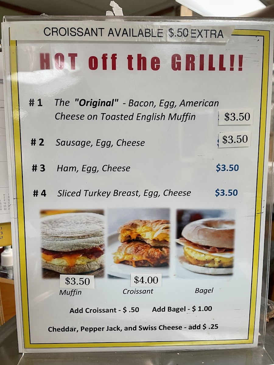 Hot Off The Grill features breakfast sandwiches such as the "Original" Bacon, Egg, and American Cheese on a toasted English muffin, as well as variations with sausage, ham, and sliced turkey breast combined with egg and cheese.